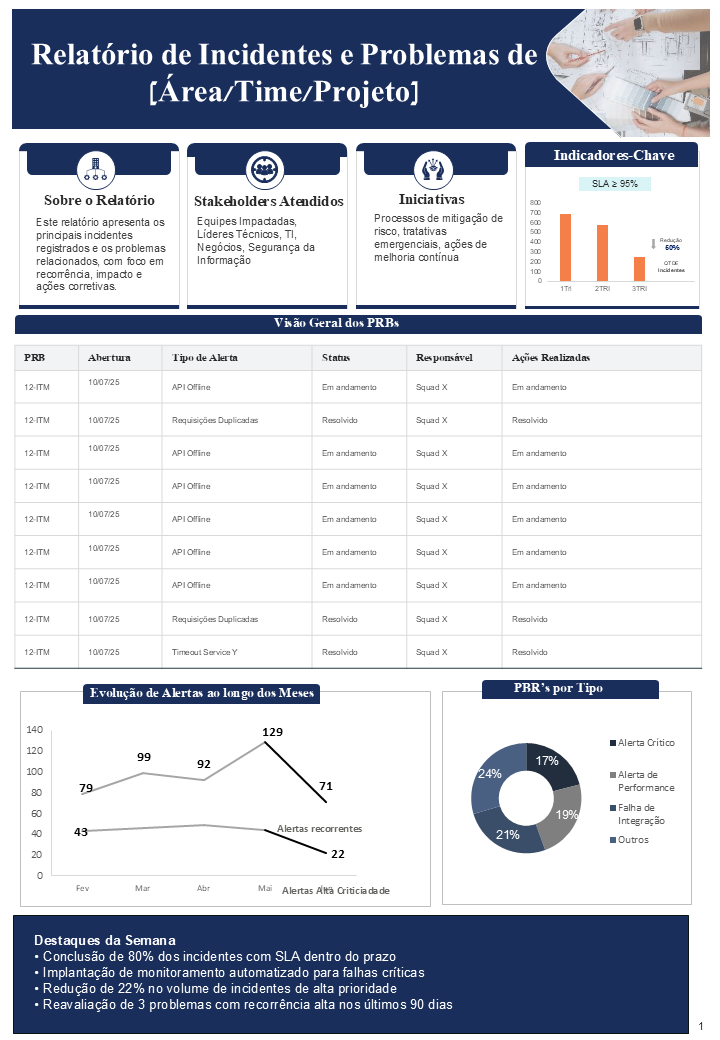 Relatório de gerenciamento de incidentes (PRBs), com visão geral, status, KPIs de SLA e destaques.